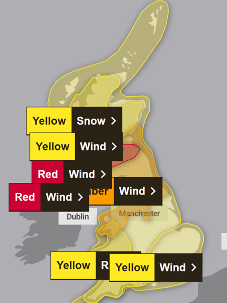 The red alert is the Met Office’s most serious weather warning and will likely cause “substantial disruption to travel, energy supplies and possibly widespread damage to property and infrastructure”, according to the agency.