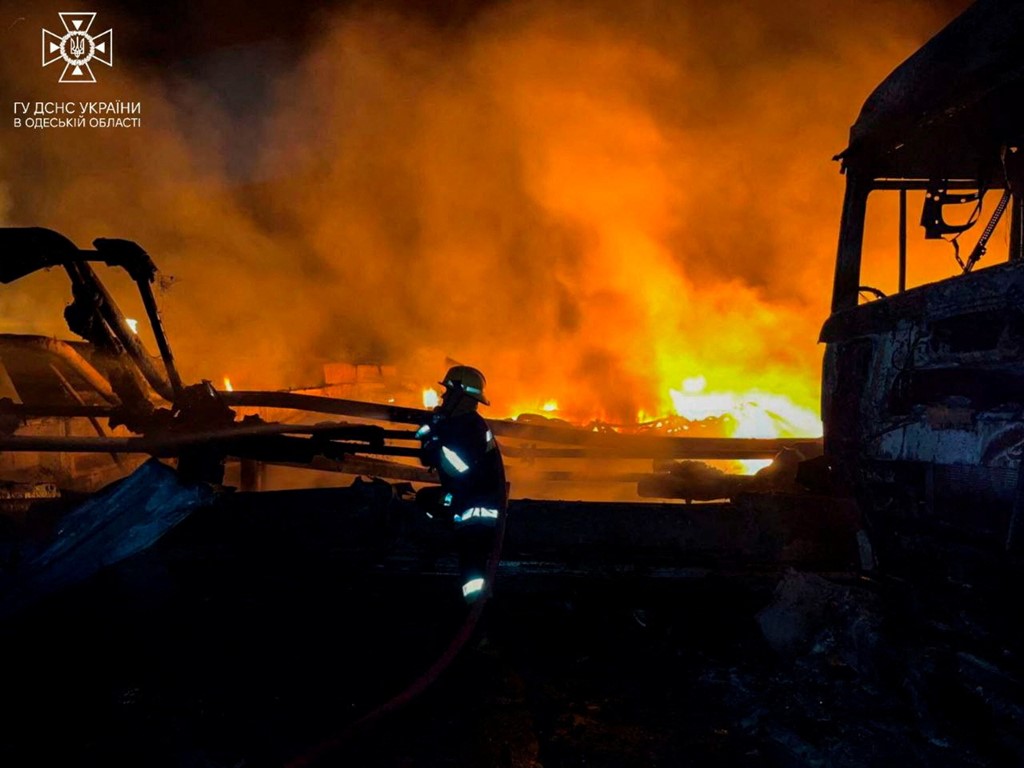 Emergency crews have been battling flames after a Russian drone barrage against port infrastructure in Ukraine’s Odesa region (see our post at 10.44am).