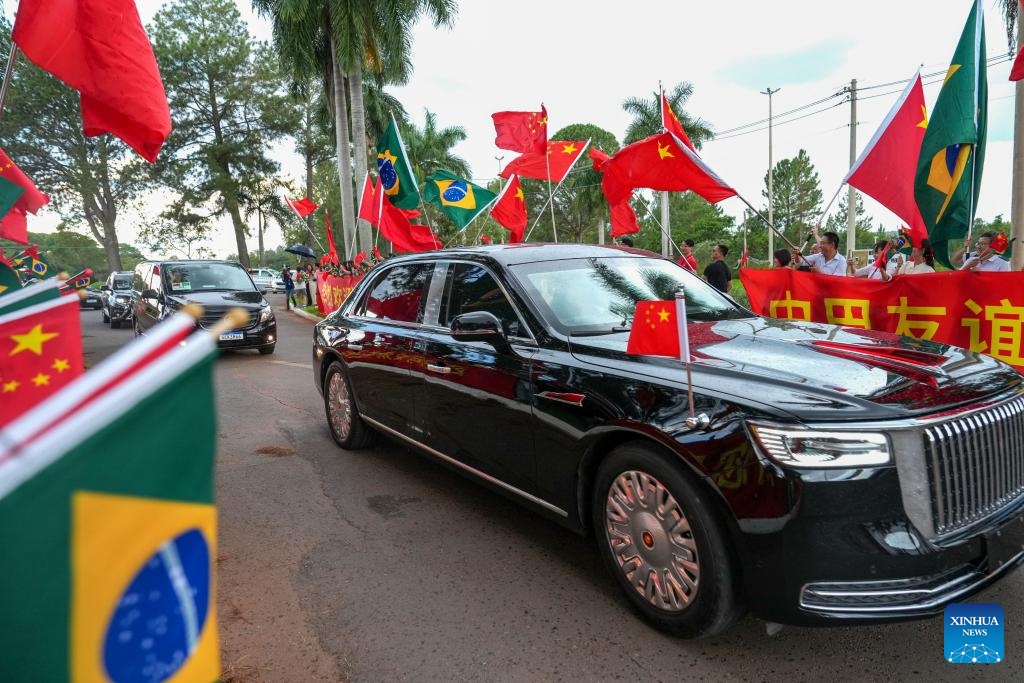 Senior Brazilian officials warmly welcome Chinese President Xi Jinping on behalf of Brazilian President Luiz Inacio Lula da Silva and the Brazilian government at Brasilia Air Base in Brasilia, Brazil, Nov. 19, 2024. Xi arrived in Brasilia on Tuesday for a state visit to Brazil. (Xinhua/Li Xueren)Chinese President Xi Jinping is greeted by an all-female local Batala band with vibrant drumbeats at Brasilia Air Base in Brasilia, Brazil, Nov. 19, 2024. Xi arrived in Brasilia on Tuesday for a state visit to Brazil. (Xinhua/Li Xueren)Chinese President Xi Jinping’s plane arrives in Brasilia, Brazil, Nov. 19, 2024. Xi arrived in Brasilia on Tuesday for a state visit to Brazil. (Xinhua/Zhai Jianlan) Representatives of overseas Chinese, local Chinese-funded enterprises and Chinese students in Brazil warmly welcome Chinese President Xi Jinping on the roadside while Xi’s motorcade is on its way from the airport to the hotel in Brasilia, Brazil, Nov. 19, 2024. Xi arrived in Brasilia on Tuesday for a state visit to Brazil. (Xinhua/Xu Rui) Representatives of overseas Chinese, local Chinese-funded enterprises and Chinese students in Brazil warmly welcome Chinese President Xi Jinping on the roadside while Xi’s motorcade is on its way from the airport to the hotel in Brasilia, Brazil, Nov. 19, 2024. Xi arrived in Brasilia on Tuesday for a state visit to Brazil. (Xinhua/Xu Rui)
