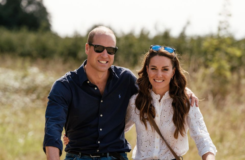 William is wearing sunglasses; jeans and a blue shirt and Kate is wearing a white shirt and jeans. A pair of sunglasses rests on Kate’s head.