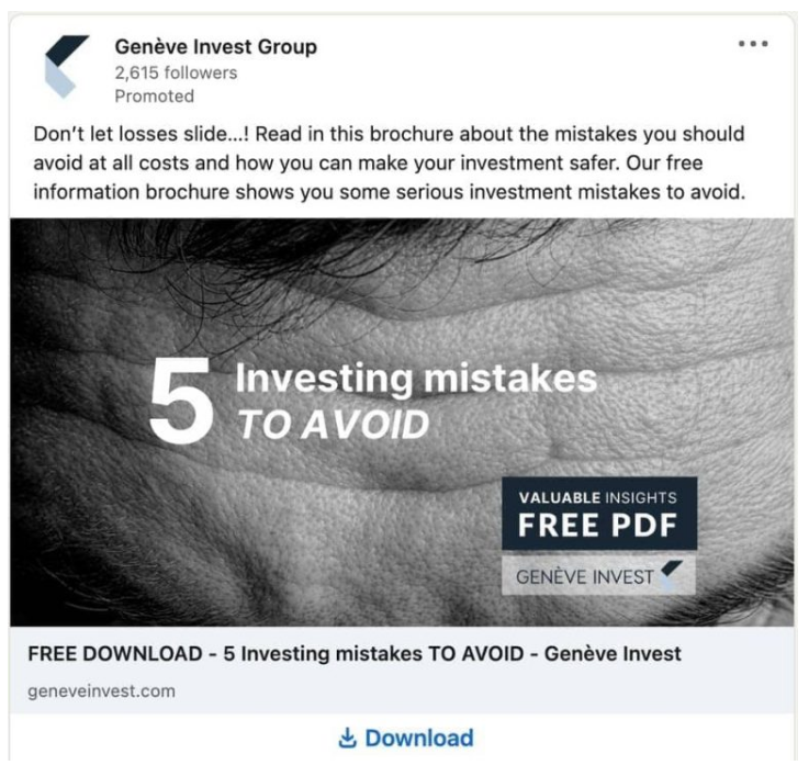 As a case study on applying the 4 Cs, let’s improve some ad copy on LinkedIn from Genève Invest Group: