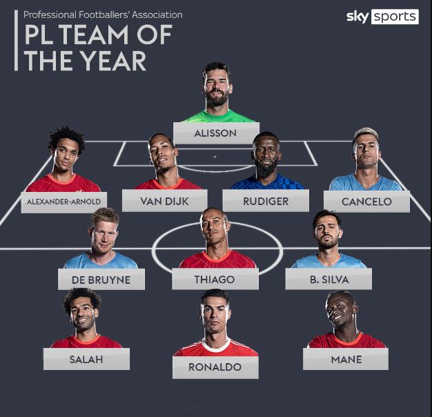 Six Liverpool players – Alisson Becker, Trent Alexander-Arnold, Virgil van Dijk, Thiago, Sadio Mane and Mohamed Salah – included; Joao Cancelo, Bernardo Silva and Kevin De Bruyne represent champions Manchester City; Antonio Rudiger and Cristiano Ronaldo complete the XI