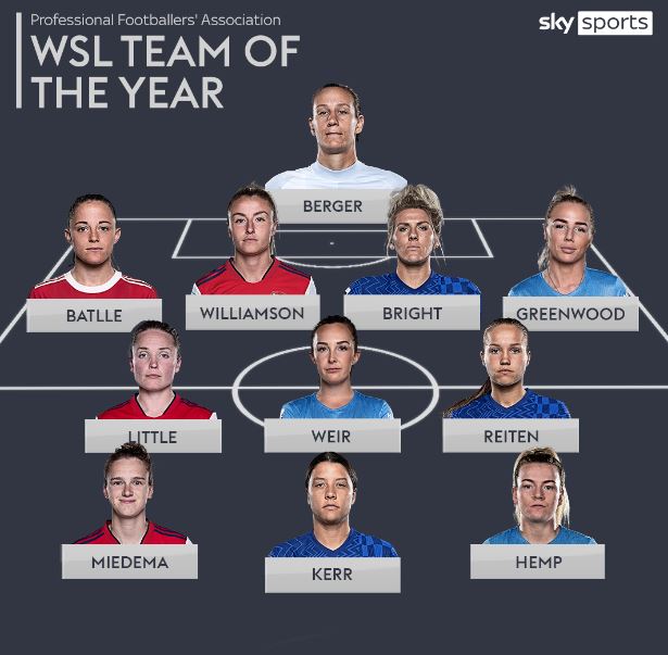 Arsenal finished the season merely one point shy of the Blues and are one player shy in the XI, with Leah Williamson, Kim Little and goal machine Vivianne Miedema making the grade.